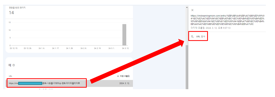 - 색인이 생성되지 않은 주소를 클릭하면 오른쪽에 나오는 URL검사를 해줍니다.