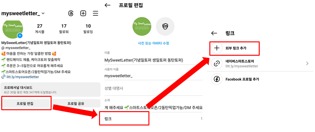 √ 프로필 편집▶링크 ▶외부링크 추가 ▶리틀리에서 복사한 주소입력
