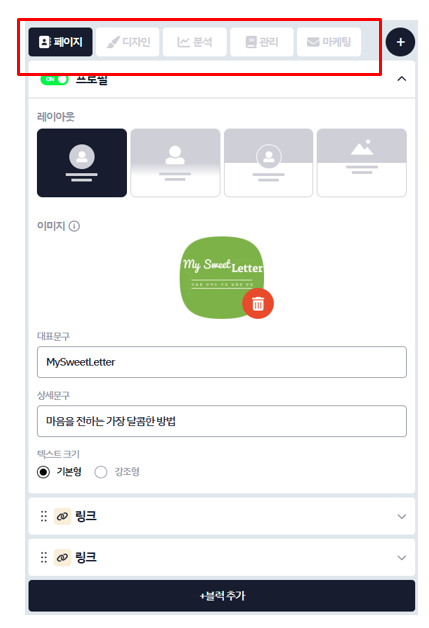 √ 페이지 탭에서 링크추가를 눌러 추가하고 싶은 링크를 연결