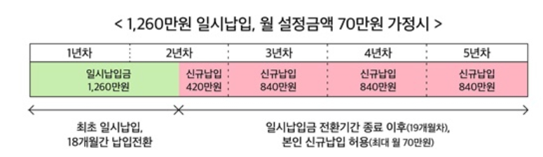 - 가입일에 관계없이 매월(1일~말일까지) 70만 원, 연간 납입한도 840만 원 초과 불가