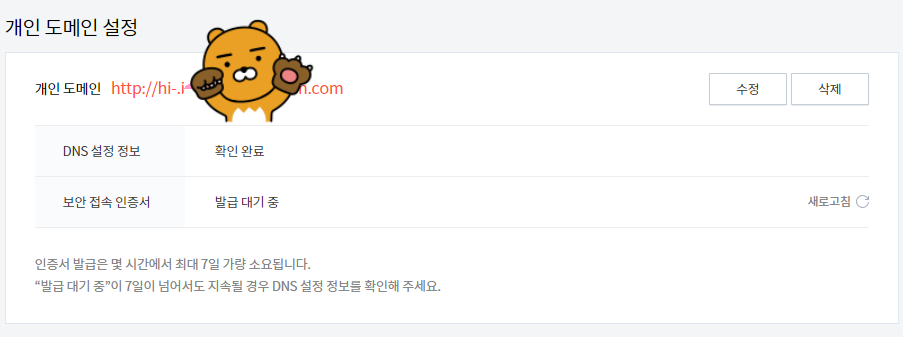 개인도메인 설정에 가서 내가 만들어둔 하위 도메인을 입력 후 변경사항 저장을 누르면 됩니다.