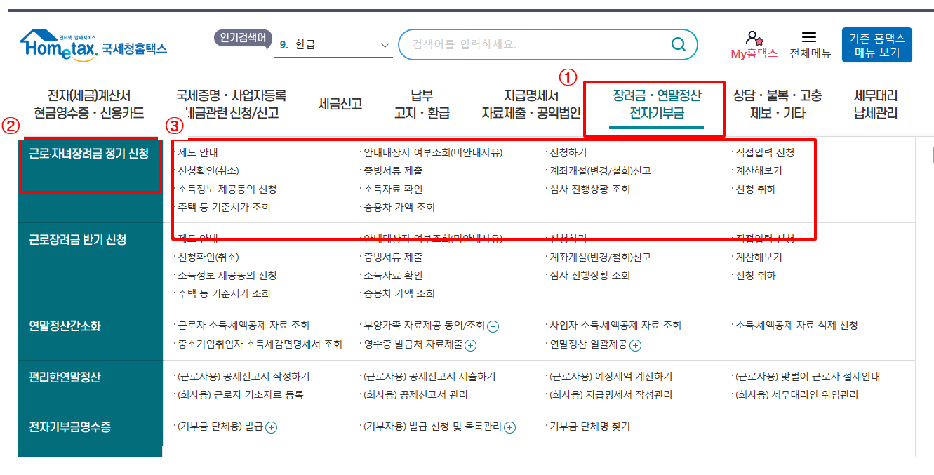 - 홈택스 로그인 ▶ 장려금/연말정산/전자기부금 ▶ 근로/자녀장려금 정기신청 ▶ 신청하기