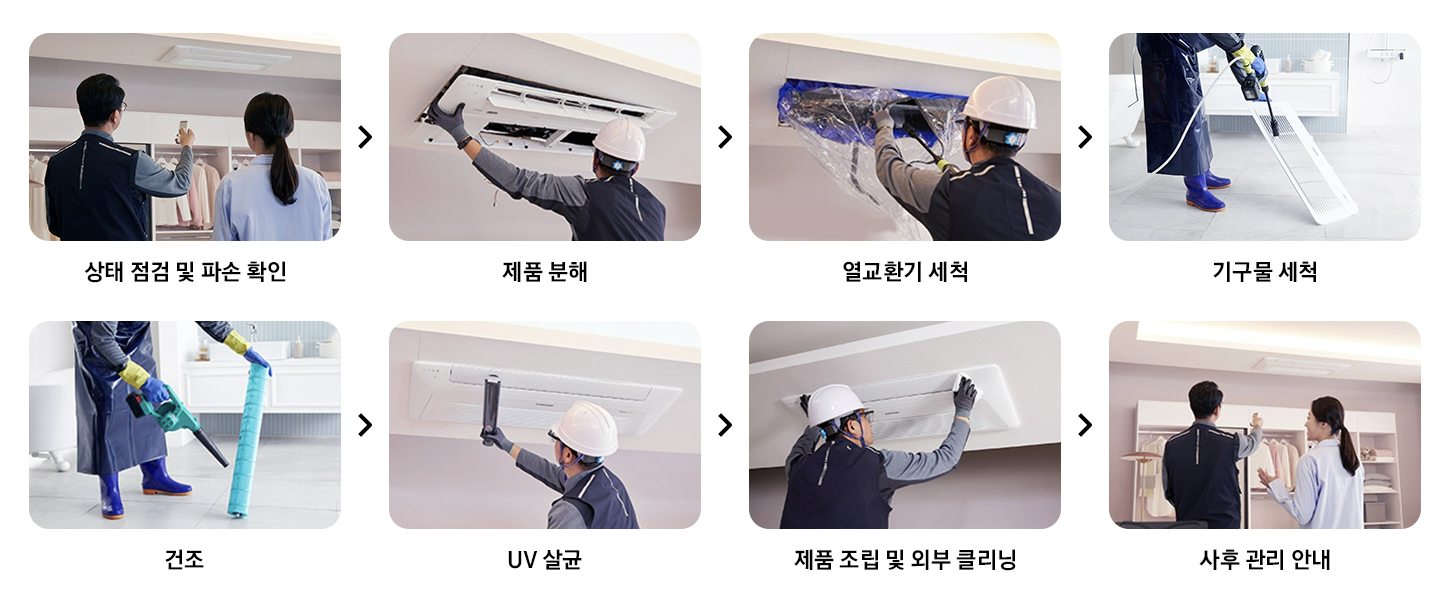 비공식 업체나 셀프 청소는 제품에 손상을 줄 수 있습니다. 삼성 케어서비스는 공식 인증을 받은 기사님이 방문하여 전문 장비로 안전하게 청소합니다.
